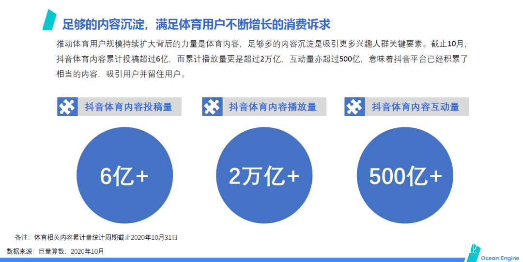 2020年,一個明顯的感覺是抖音的體育內容佈局加速。眾多優質體育內容的加入,也吸引了更多興趣人羣的關注。數據顯示,截止10月,抖音體育內容投稿量超過6億,累計播放量超過2萬億,互動量超過500億。