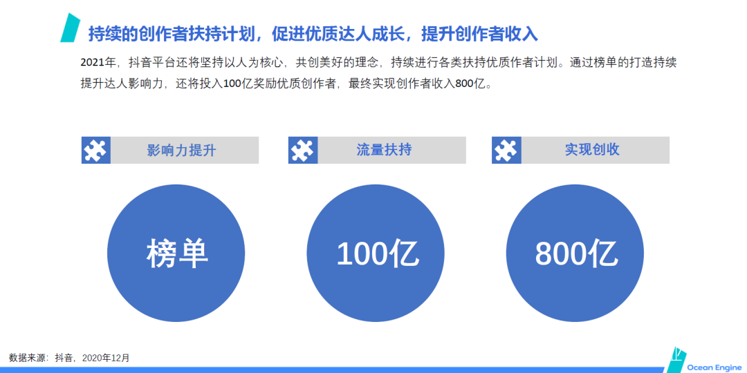 據瞭解,2021年,抖音平台還將堅持以人為核心,共創美好的理念,持續進行各類扶持優質作者計劃。通過榜單的打造持續提升達人影響力,還將投入100億獎勵優質創作者,最終實現創作者收入800億。