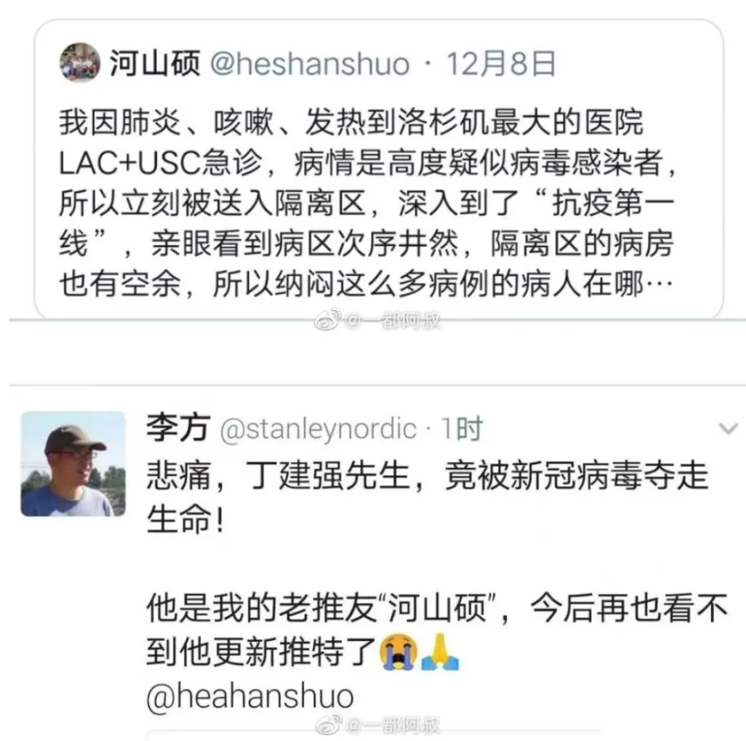 他的朋友“直接民主”還在鼓吹——美國為他花了上百萬美金……還在鼓吹“如果丁健強在中國,早就死了……",他的意思是,河山碩到死對美國都只有感恩。可惜,經歷過抗疫的人們都知道,河山碩如果在中國,哪怕是在一個縣城醫院,他都有99%的可能活下來。