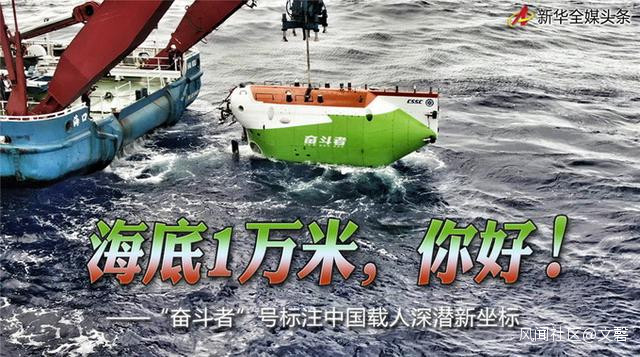 11月10日中國自主研發的“奮鬥者”號載人潛水器,在地球海洋的最深處太平洋馬裏亞納海溝,成功坐底,深度達10909米,再創中國載人“探海深潛”的新紀錄,與此前報道的人類已達的最深的深潛深度,處於同一水平。【美國和加拿大曾報道,深潛馬裏亞納海溝近35853英尺(10927米)和35800英尺(10912米)、35787英尺(10908米)。】