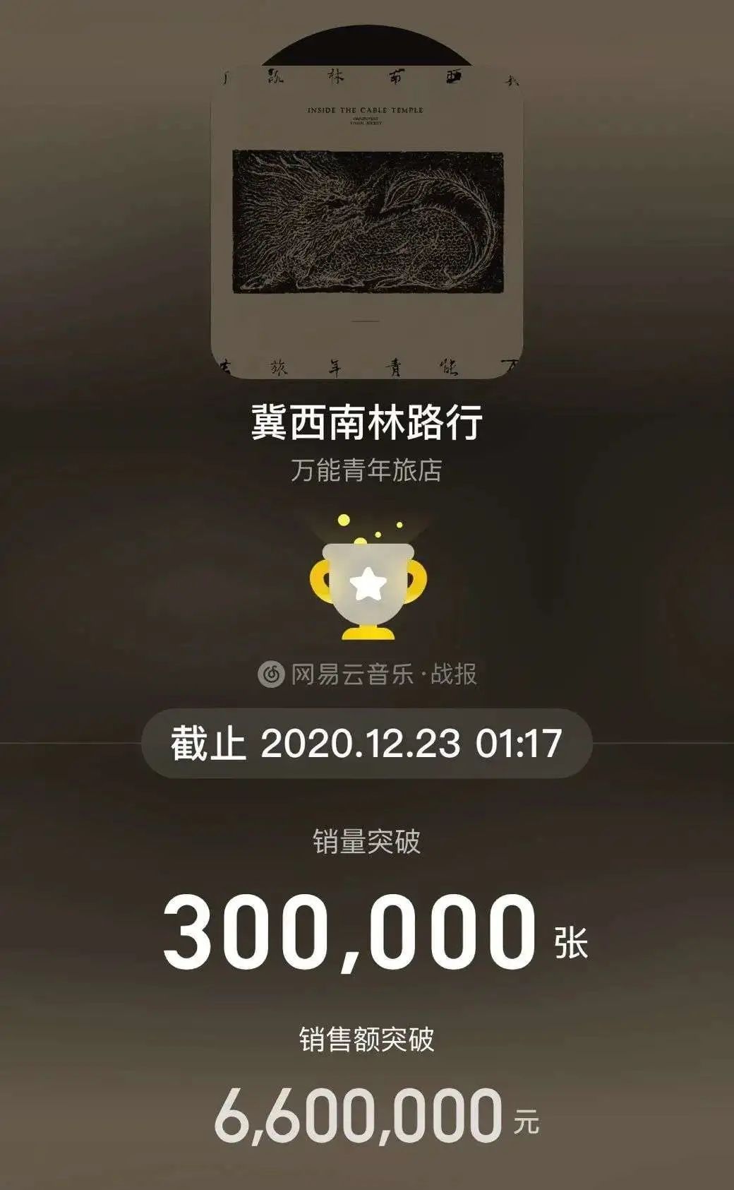 萬青發第一張專輯的時候,科技的大時代還在醖釀。但十年後,數據已經能概括一切,最能反應萬青的數據,出現在網易雲音樂的銷量界面中,上架一天,《冀西南林路行》銷量突破三十萬張。