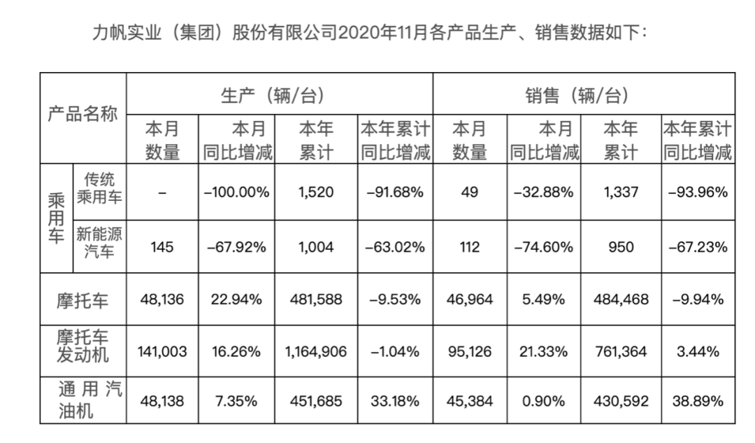 今年11月,力帆傳統乘用車產量歸零;銷量為49輛,同比下滑32.88%。同期,新能源車產量僅為145輛,同比下滑67.92%;銷量為112輛,同比下滑74.6%。