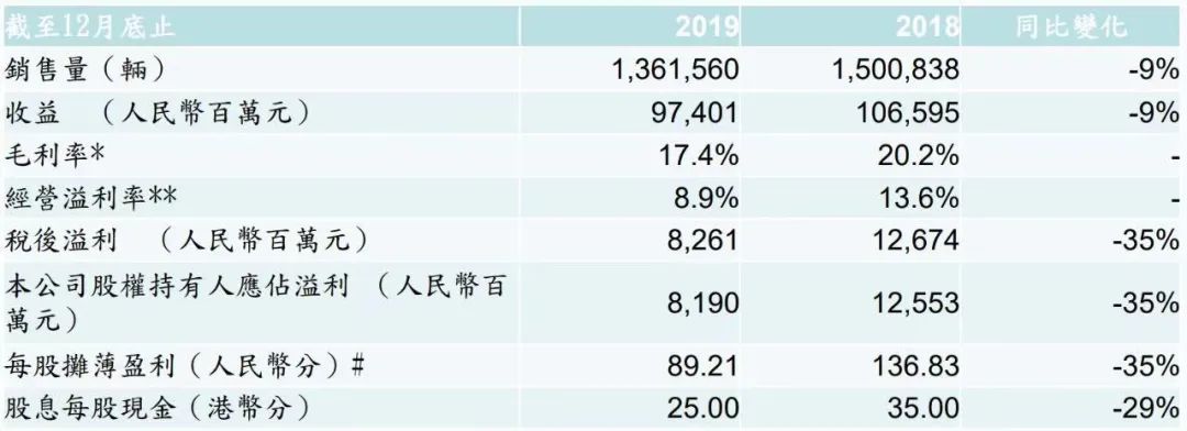 業績報告顯示,2019年,吉利汽車營收974億元,較2018年下滑9%;淨利潤為81.89億元,同比降低35%。