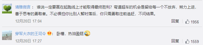 甚至不少考研學子表示,自己也受到了鼓舞。她們説:“只要賽道夠長,努力的人都會有好結果。”“別相信贏在起跑線上,只要堅持,説不定你就能夠贏在終點。”