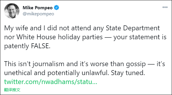 蓬佩奧本人迅速在推特上回應此事,抨擊彭博社的報道,稱其“明顯是錯誤的”。