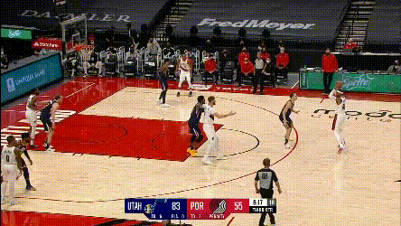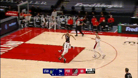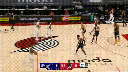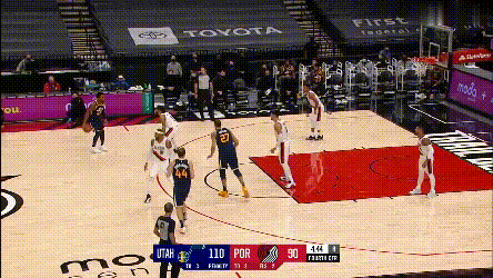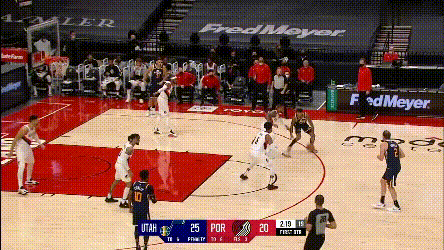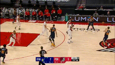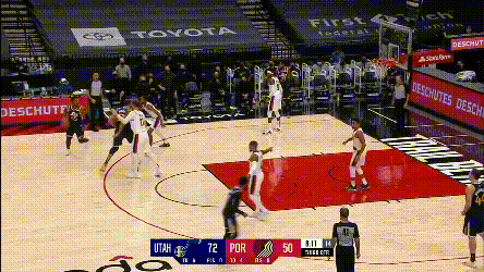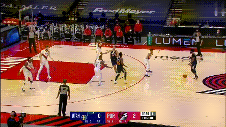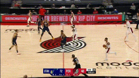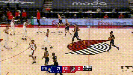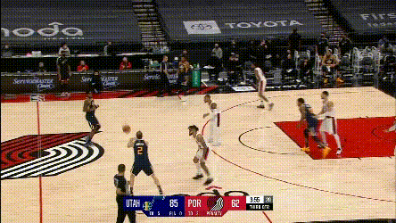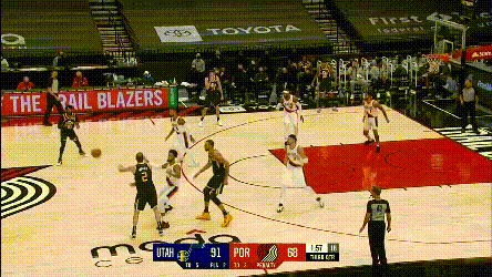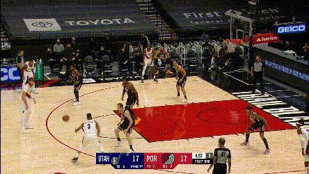第一點,開拓者兩個協防型鋒線,總有一個要拿去對位爵士的一線擋拆手,因為雙槍都不適合一線防特別強的主攻手,不然的話,就是穩吃掩護,比如: