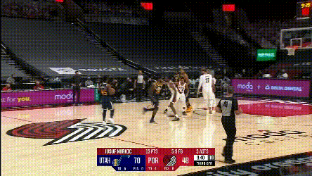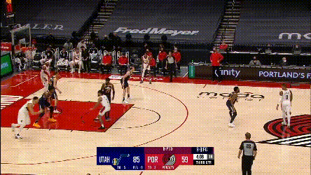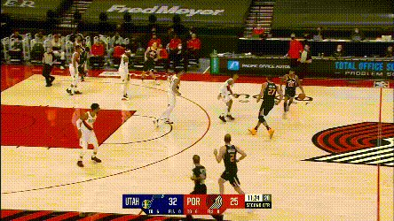 我們再説開拓者要怎麼防爵士——很難,最好的辦法是換防,但開拓者後場雙槍的配置擺在這,決定了他們沒法走這個路子,然後就要在蹲坑和夾擊之間選。