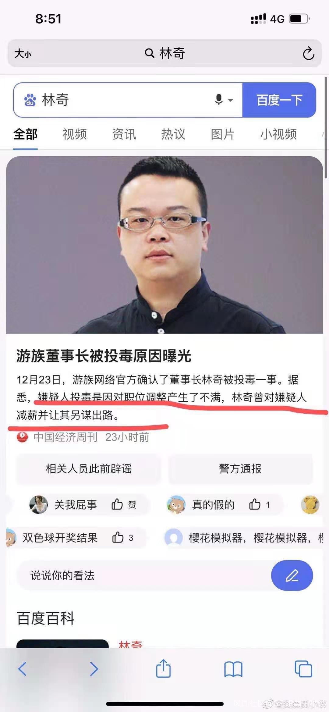 一切源於他有一個恨他入骨,巴不得他死的人——2020年12月23日,兩張關於遊族網絡創始人林奇被投毒而住院的消息在社交平台上流傳,截圖顯示,“遊族網絡董事長林奇被人通過陳年普洱投毒,上週六搶救回來但腦死亡,成植物人。兇手已招認,是遊族影業CEO許垚。