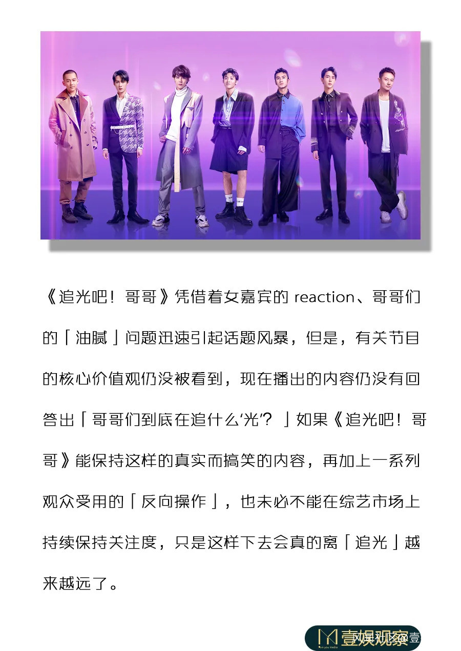 節目組最終的設定是選出阿里巴巴公益基金會合作的公益大使,而這個設定也沒有給到節目的核心和傳遞的精神的明朗化。在“追”的光是什麼仍沒有給出答案的情況下,《追光吧!哥哥》憑藉着真實的reaction和打出的“油膩”議題,引起了聲量,也似乎更向着競演喜劇真人秀的方向前進。