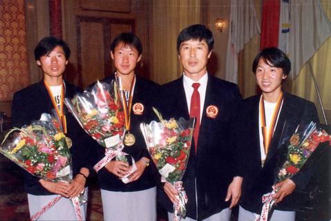 90年代,馬俊仁和他的弟子王軍霞(左四),曲雲霞(左一)以及劉東(左二)