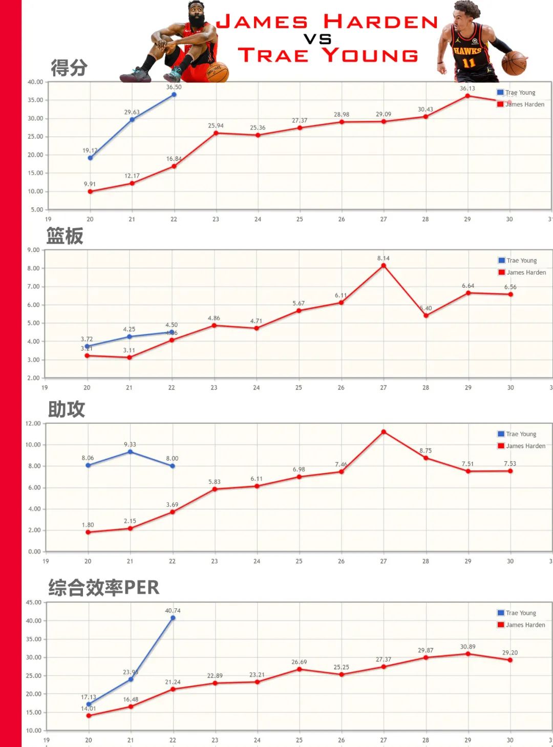 然而現在勢頭最猛的是特雷·揚。**當哈登的肥皂劇一出接一出時,特雷·揚已經開始搶班奪權,在蟬聯三屆得分王后,大鬍子的這一位置受到了來自東部新鷹王的挑戰。**每個時代,新人換舊人都是永恆不變的話題。