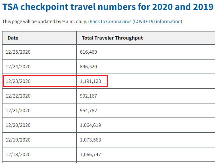 美國安全管理局(TGA)的數據顯示,在聖誕節前的12月23日,美國有超過119萬人選擇乘坐航班出行,創下了自今年3月以來的最高記錄。這對於遏制疫情傳播而言,絕對不是一個好消息。