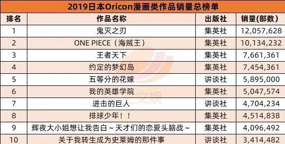 但是,到了2019年,《鬼滅之刃》就一躍成為了日本最暢銷的漫畫。1205萬部的年銷量,高出《海賊王》近200萬部。打破了《海賊王》12連冠的年度銷售記錄**(2005年被《NANA》超過)**,成為銷量第一的漫畫。