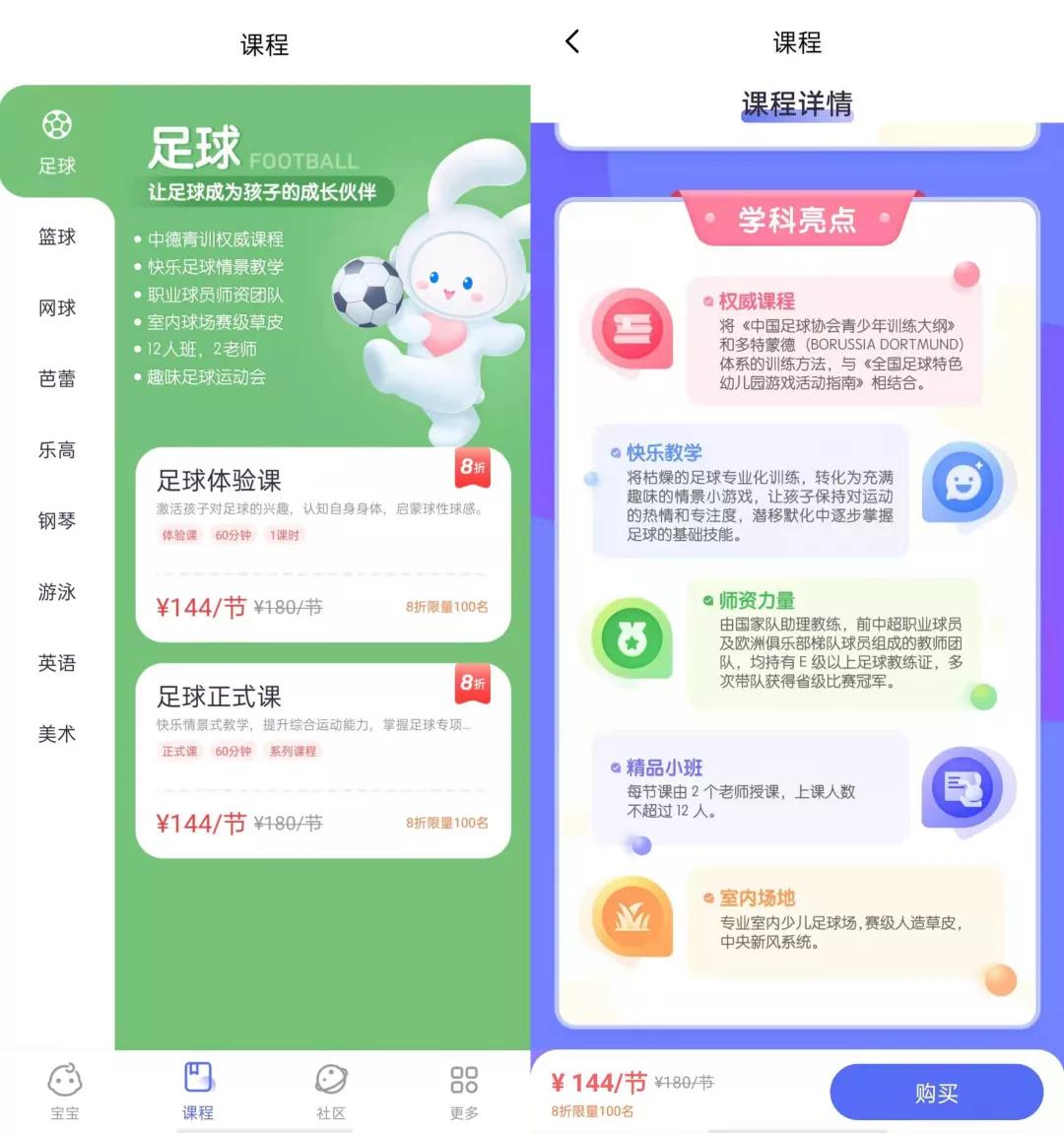打開趣店的萬里目少兒App可以注意到,這是一個宣稱為3-8歲孩子提供素質教育服務的平台。到目前,平台已開設足球、網球、芭蕾、樂高、鋼琴、游泳、英語、美術8個科目。最高的價格出現在游泳課上,288元一節。