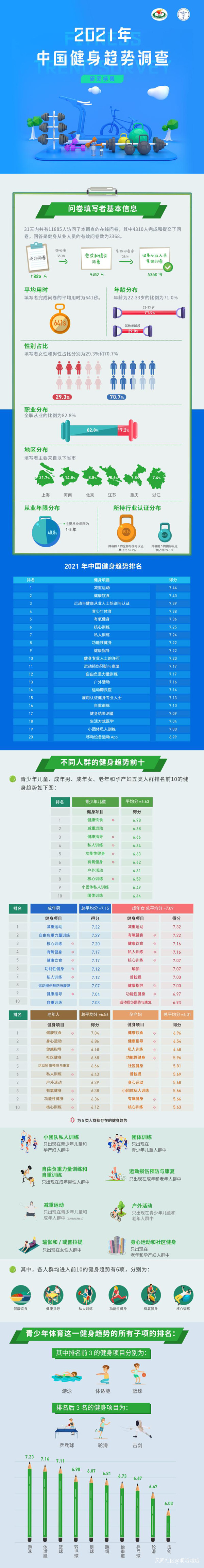 代表課題組公佈了2021年中國健身趨勢調查結果。2021年排名前20的中國健身趨勢分別為減重運動、健康飲食、運動與健康從業人士培訓與認證、青少年體育、有氧健身、核心訓練、私人訓練、功能性健身、健康指導、健身專業人士的許可、運動損傷預防與康復、自由負重力量訓練、户外活動、運動即良醫、僱用認證健身專業人士、自重訓練、健身結果測量、生活方式醫學、小團體私人訓練、移動設備運動App。課題組代表上海體育學院體育教育訓練學院教授黎涌明介紹説,“減重運動”在2018年的《中國健身趨勢》報告中位列第19位,這幾年的“地位”明顯提高,這也表明了健身人羣對於健身需求的改變。