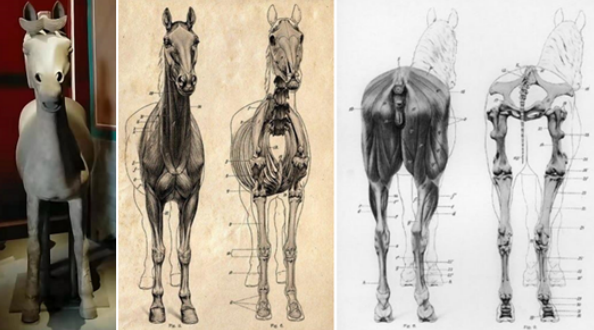 秦馬剪鬃縛尾,四蹄 佇 立。肩長而斜;上膊長度約為肩長的一半;肘長而大;前膊長直;前膝關節強大;管短直;球節圓而強大;系長短適中。後肢股長,寬,厚重;後膝圓大,韌帶發育好;脛短利於挽曳;飛節端正;後管骨骼堅實;後球節圓寬結實;後系比前系長且粗,具備良馬的基本特徵。(左圖為故宮雕塑館文物實拍)