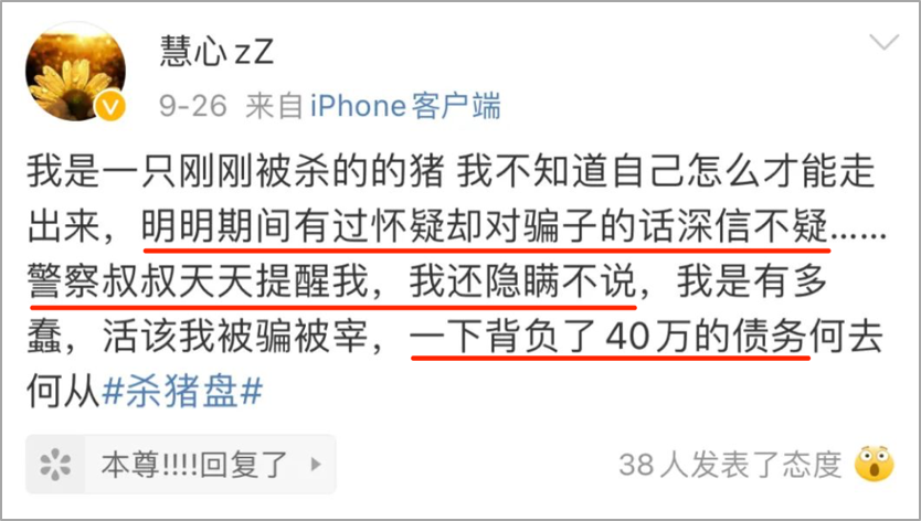 在那條刷屏微博裏,網友@慧心zZ稱自己是一頭“被殺的豬”。因為陷入一場網絡騙局,她一夜之間背上了40萬債務。