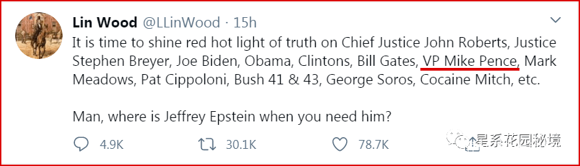 2020年12月26日,川建國的私人律師林伍德在推特上開噴那些與愛潑斯坦性奴島事件有關聯的“華盛頓沼澤罪犯”…民主黨人和公開的RINO都在其列,然而,令人震驚的卻是:副總統彭斯也在名單之中…