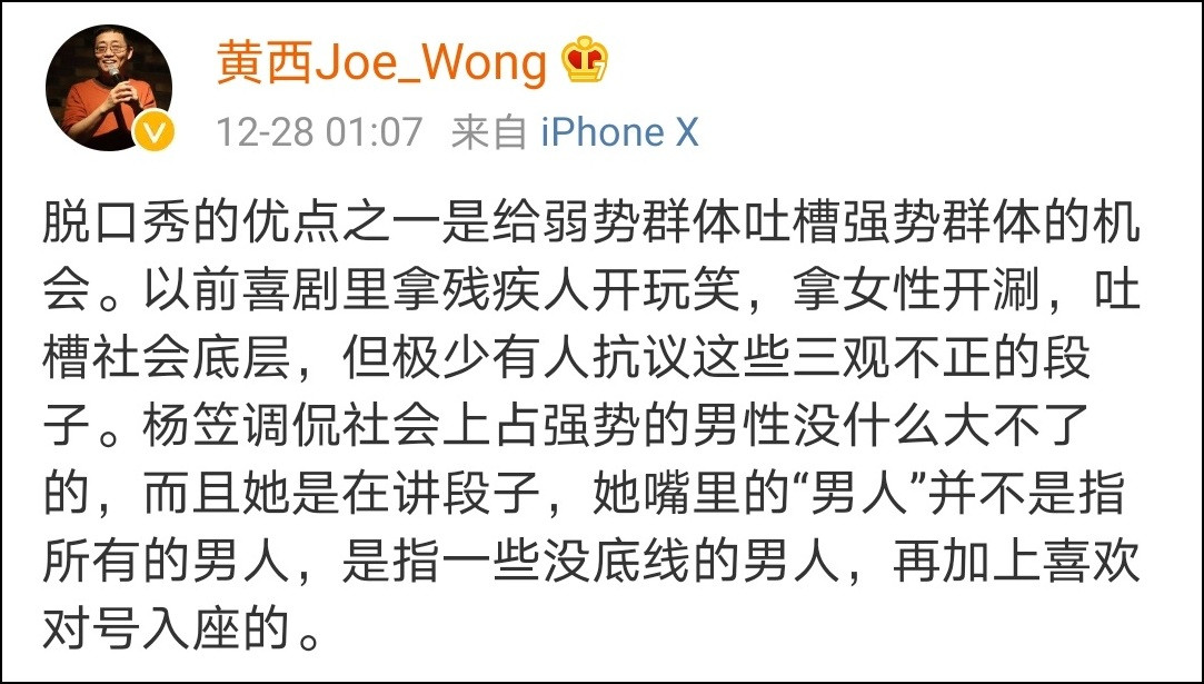 黃西表示,“楊笠調侃社會上占強勢的男性沒什麼大不了的,而且她是在講段子,她嘴裏的‘男人’並不是指所有的男人,是指一些沒底線的男人,再加上喜歡對號入座的”。