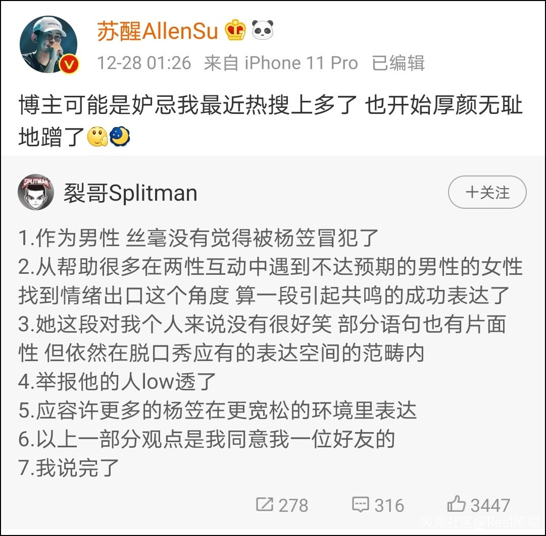 甦醒則稱,楊笠的表演沒有很好笑,但“作為男性,絲毫沒有覺得被楊笠冒犯了”。