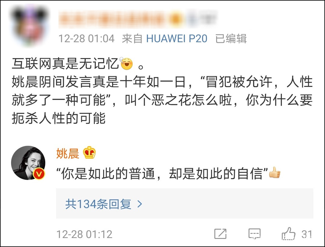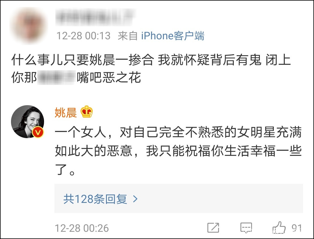 姚晨挑選了幾條,直接對線:“一個女人,對自己完全不熟悉的女明星充滿如此大的惡意,我只能祝福你生活幸福一些了”,“你是如此的普通,卻是如此的自信”,“你連人都不是,也難怪聽不懂人話”。