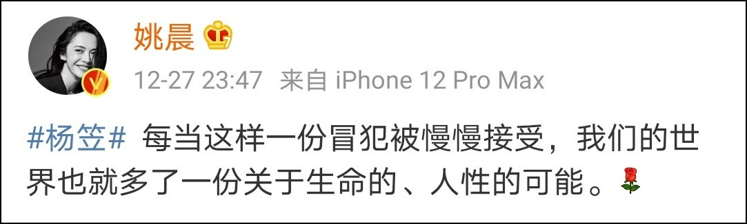 在他們之前,演員姚晨也説:“每當這樣一份冒犯被慢慢接受,我們的世界也就多了一份關於生命的、人性的可能。”