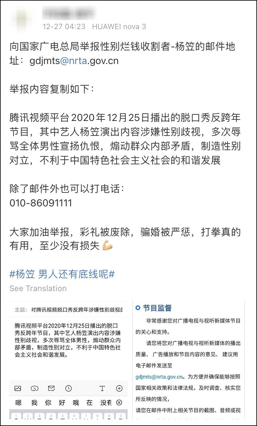 原因在於,當天早些時候有網友認為楊笠的演出內容“涉嫌性別歧視,多次辱罵全體男性宣揚仇恨,煽動羣眾內部矛盾,製造性別對立”,不利於社會和諧,要向主管部門舉報。
