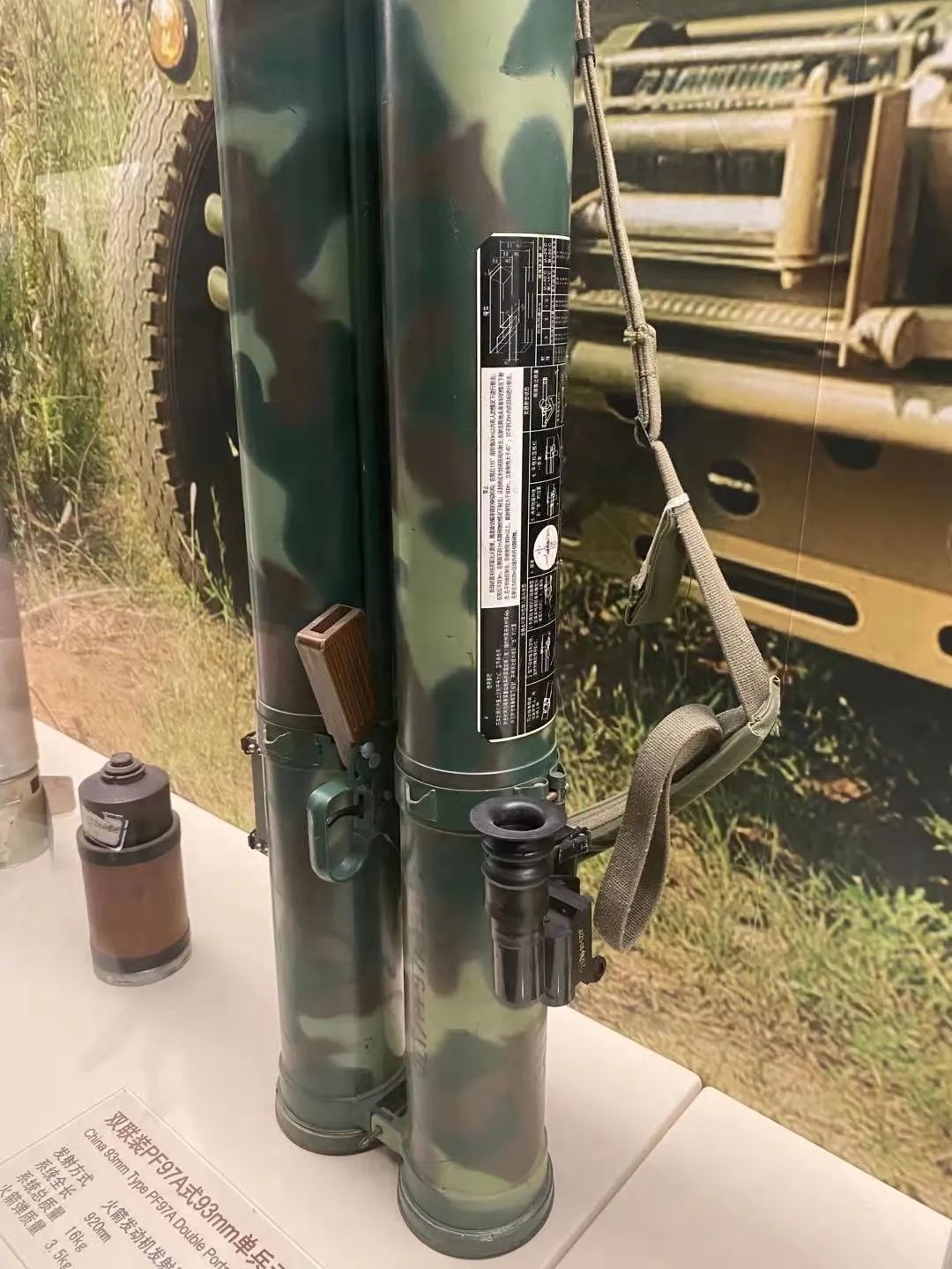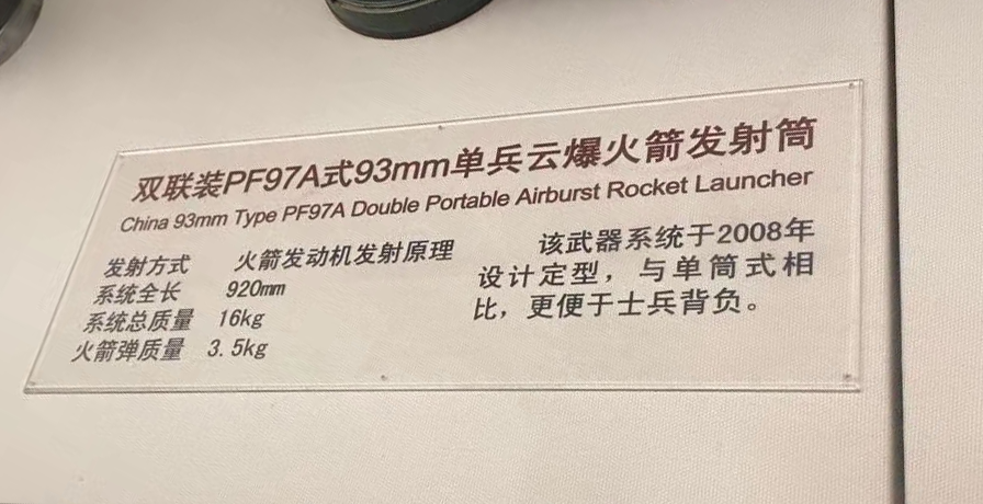 從展覽館的標牌可以看出,這種雙聯裝火箭筒叫PF97A型火箭筒,顯然是PF97的plus版本。不過這並不是國內第一款雙聯裝火箭筒,在歷史上,中國曾有過三款雙管火箭筒。