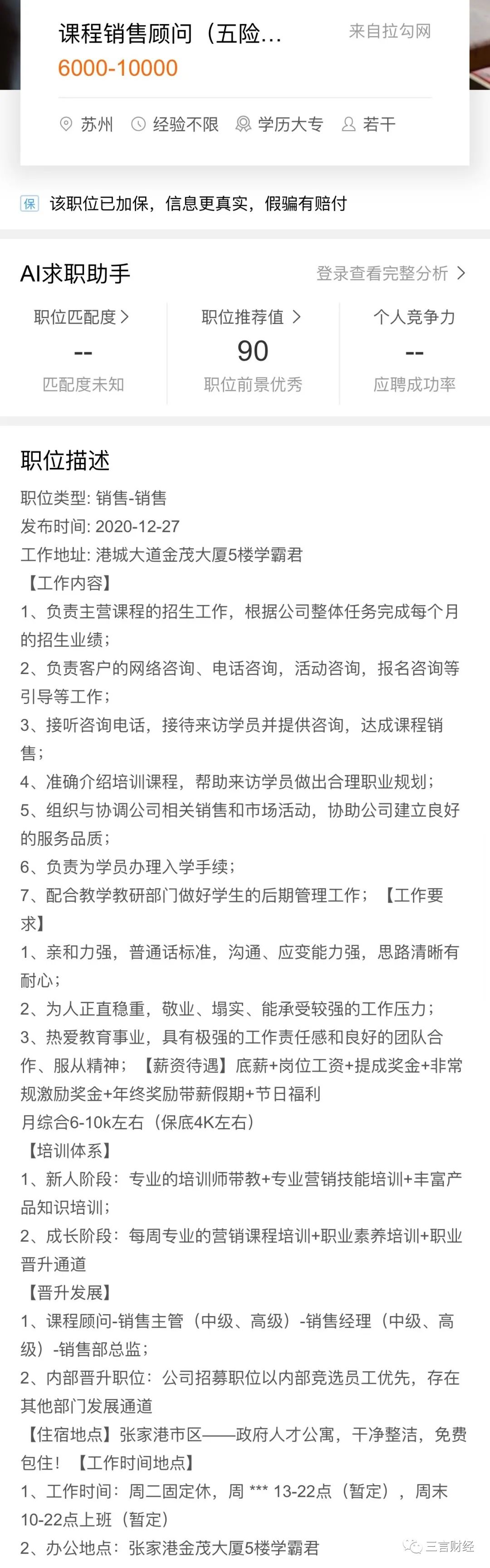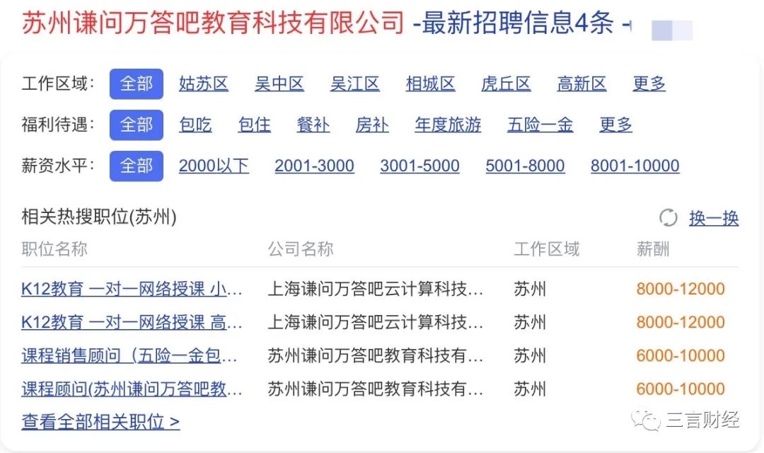 三言財經還發現,今日,蘇州謙問萬答吧教育科技有限公司還在招聘平台上發佈“課程銷售顧問”職位,職位要求與培訓課程相關。而這則招聘信息中給出的辦公地點為“張家港金茂大廈學霸君”。