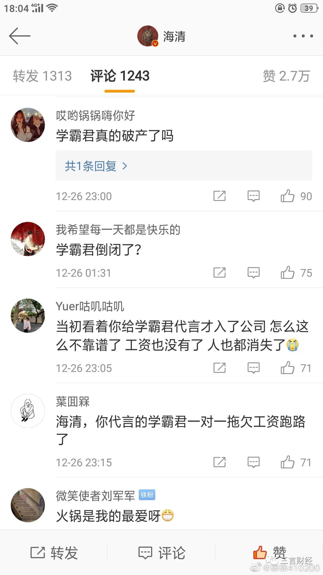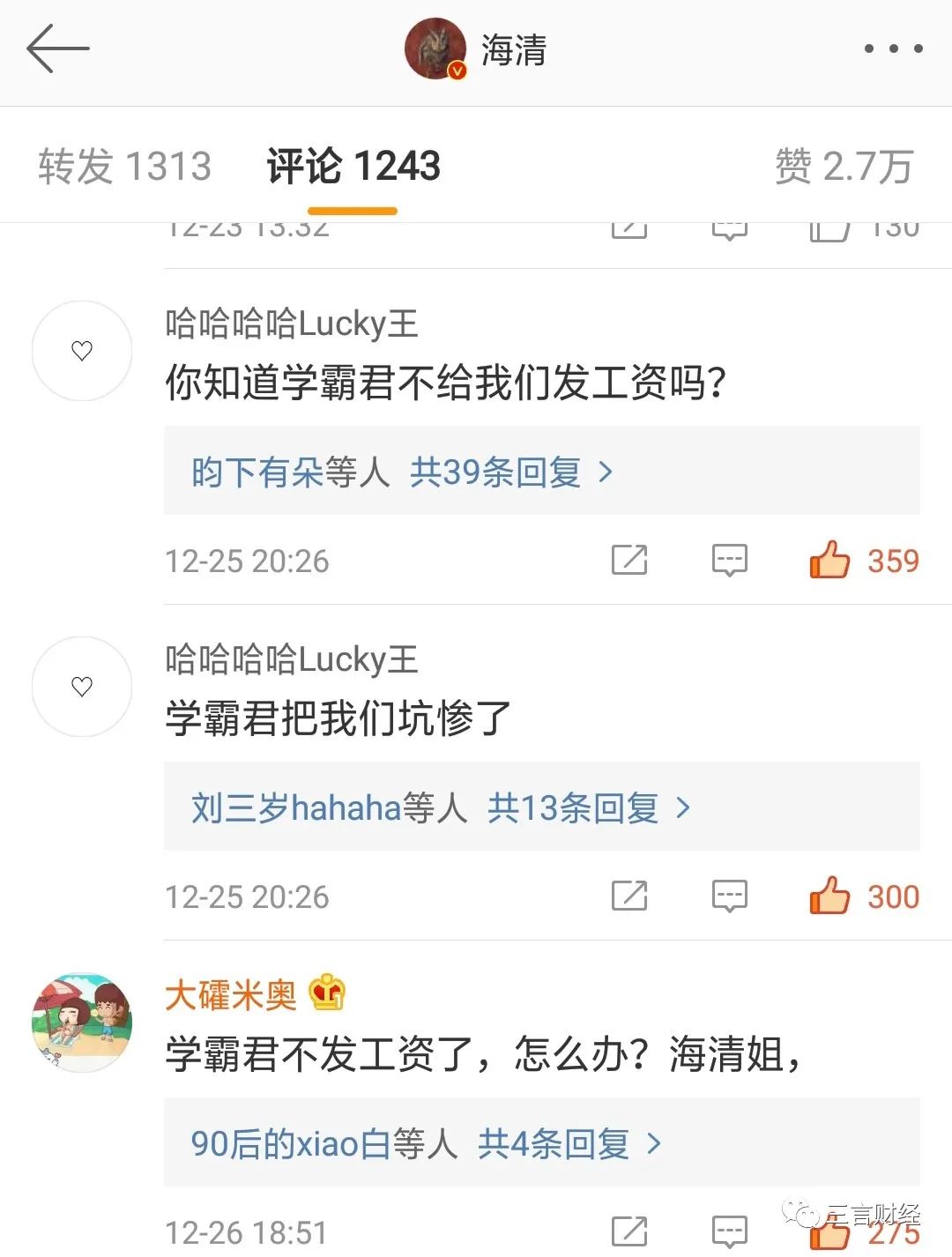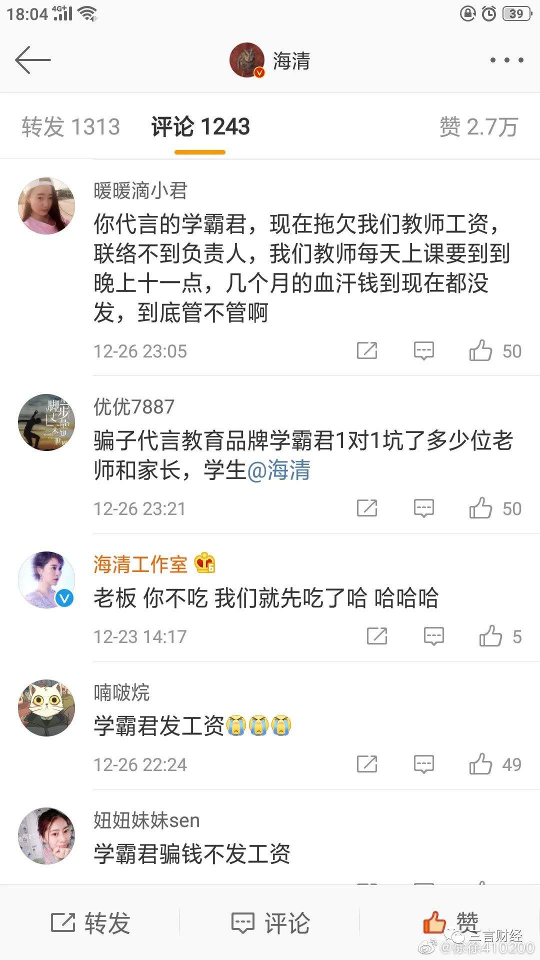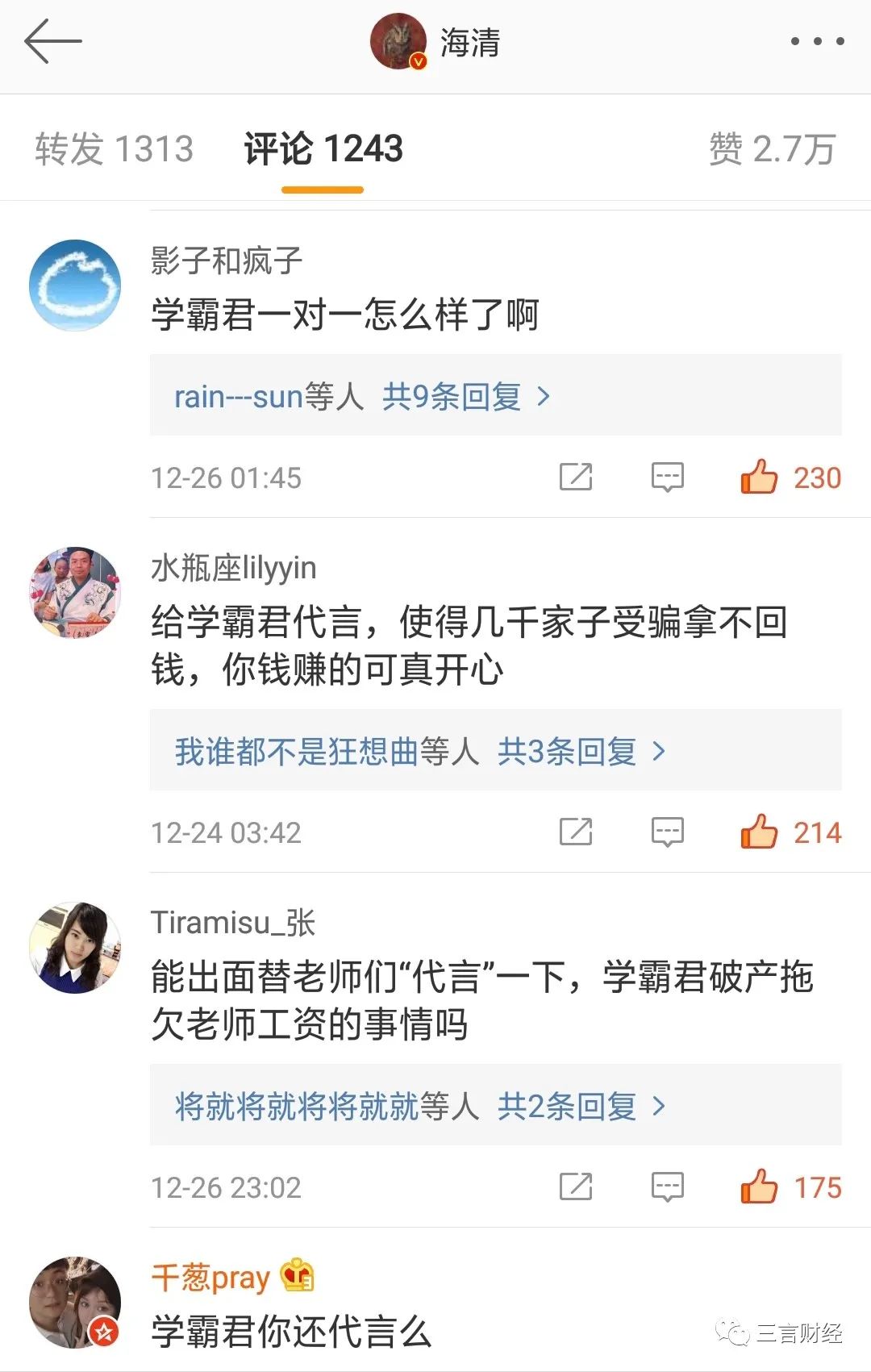 就連曾經給學霸君代言的海清微博下,也都被這些網友“佔領”,眾多網友都強調學霸君拖欠老師工資。