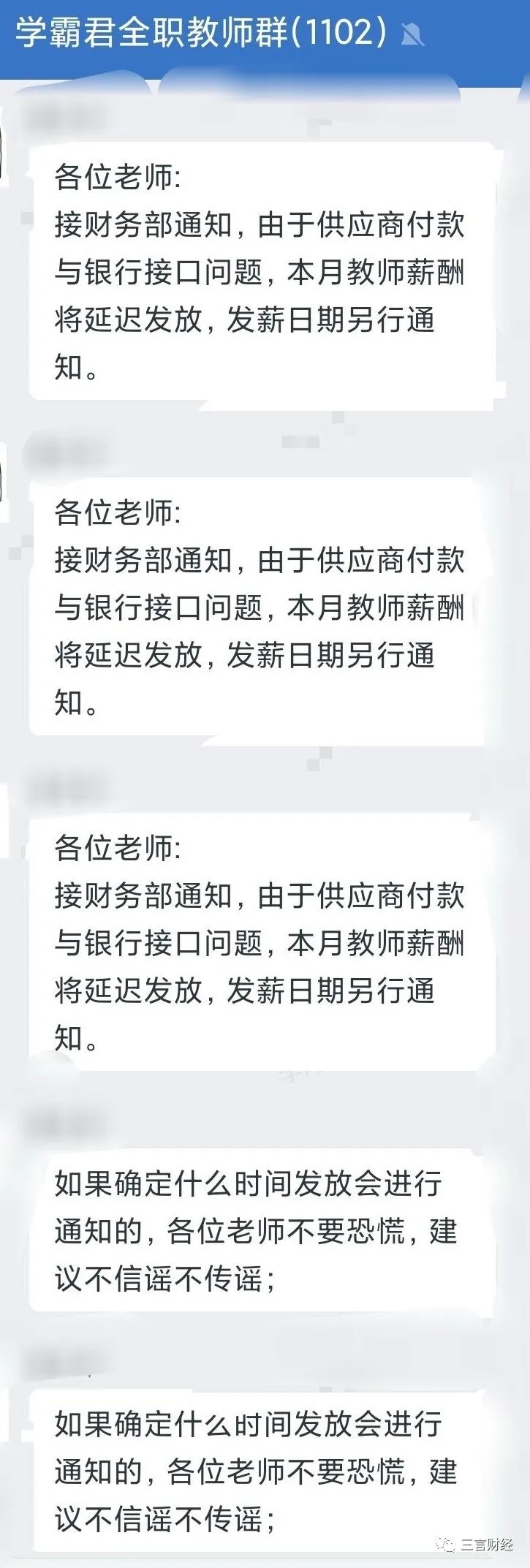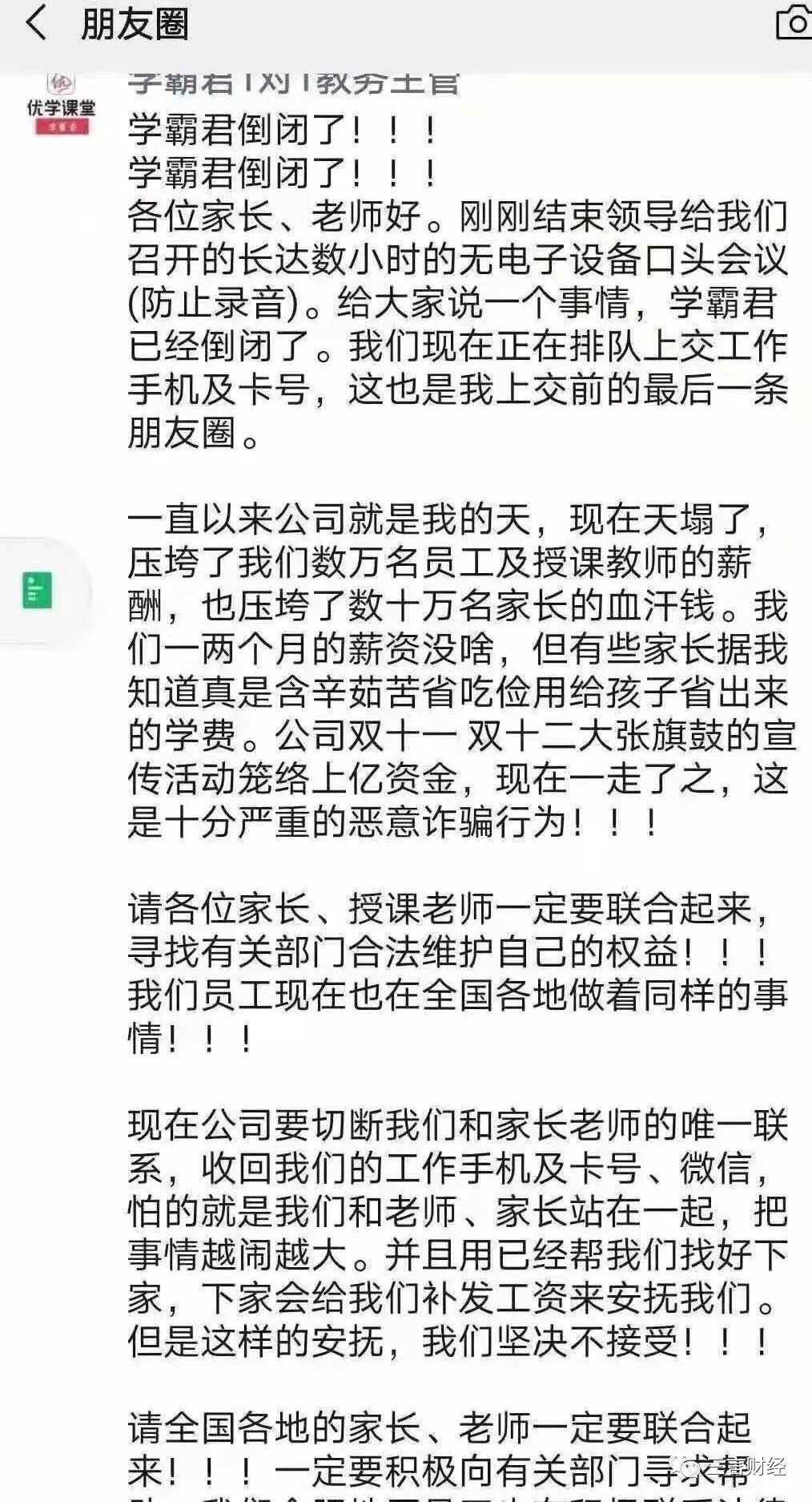 今日,一張疑似學霸君1對1教務主管的朋友圈截圖在網上流傳:學霸君已經倒閉,而且學校教師工資也拖欠不發。