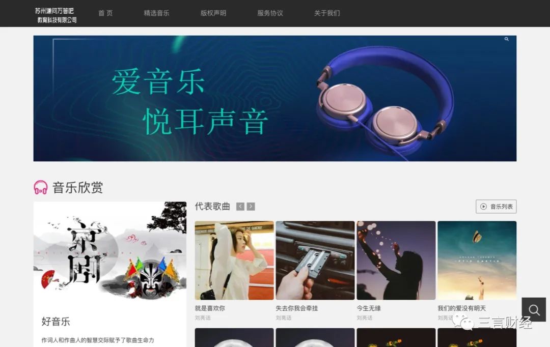 並且三言財經也找到了疑似是上述爆料者提到的張凱磊新公司的官方網站。該網站目前主要內容僅為提供一些音樂欣賞,而在網站“關於我們”頁面中,則是蘇州謙問萬答吧教育科技有限公司的簡介信息。