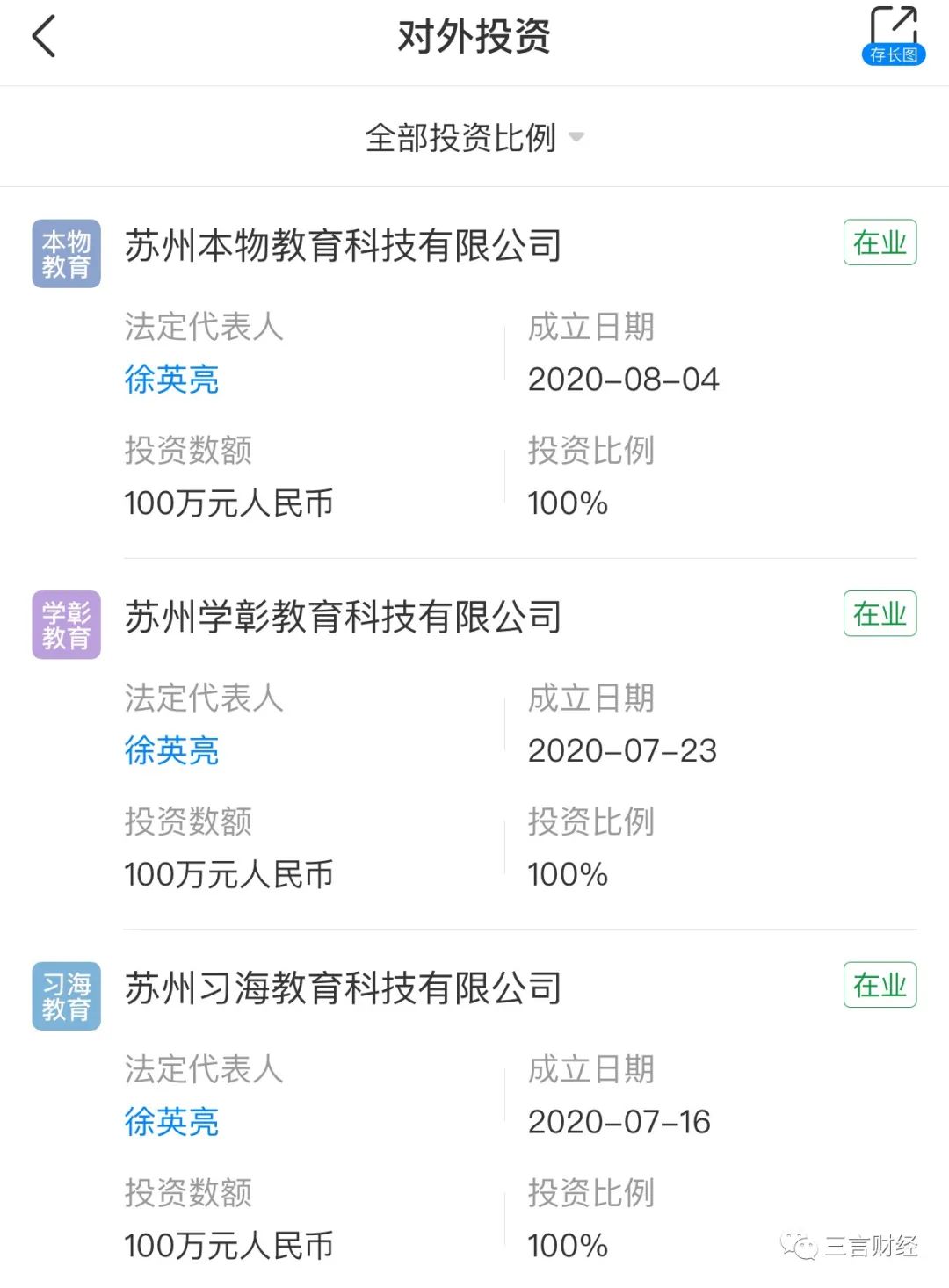 蘇州謙問萬答吧教育科技有限公司還有三家全資子公司。分別是蘇州本物教育科技有限公司,成立於2020年8月4日,投資額100萬元;蘇州學彰教育科技有限公司,成立於2020年7月23日,投資額100萬元;蘇州習海教育科技有限公司,成立於2020年7月16日,投資額100萬元。