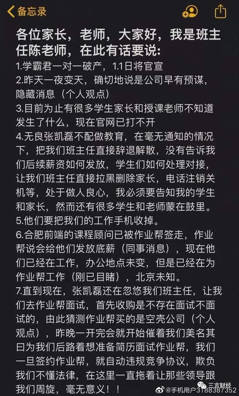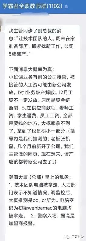 根據這張網傳截圖顯示,這名疑似教務主管稱,學霸君目前已經倒閉,員工正在排隊上交工作手機以及卡號。目前,不僅老師工資拖欠不發,而且數十萬名家長繳納的學費也無法退還。