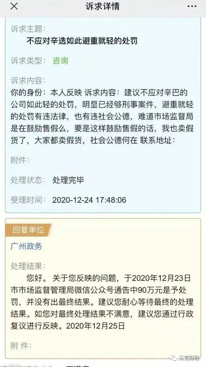 三言財經消息,近日,有網友在社交平台發文稱,在廣州政務反映了“不應對辛選如此避重就輕的處罰”的訴求。
