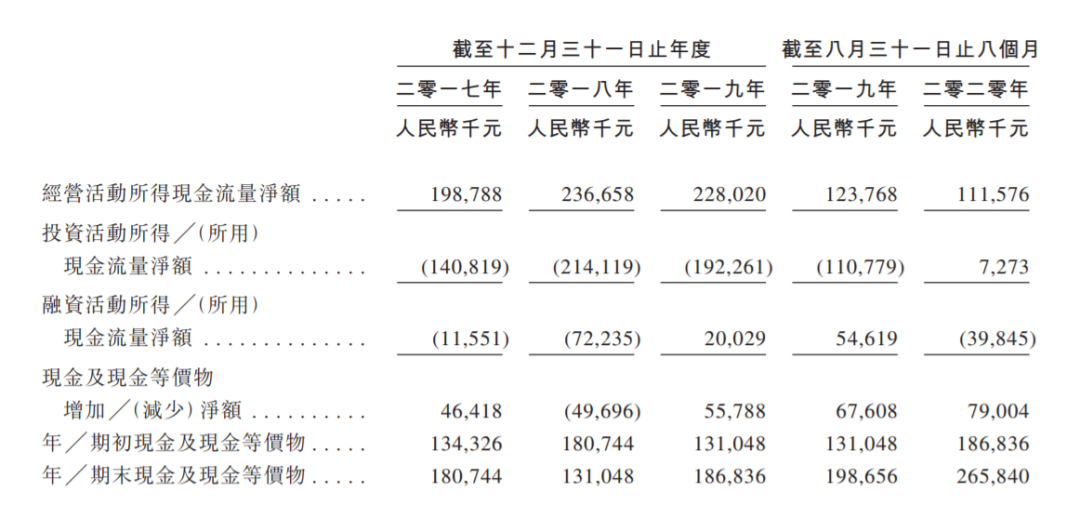 比較積極的信號是,嶺南教育的現金情況比較樂觀。2017-2019三個年度,其經營活動現金流處於淨流入狀態。截至今年8月31日的8個月,現金淨流入1.12億元。現金及現金等價物2.66億元,比年初增加了7900萬元。而上市融資也將為其現金流帶來一定的補充。