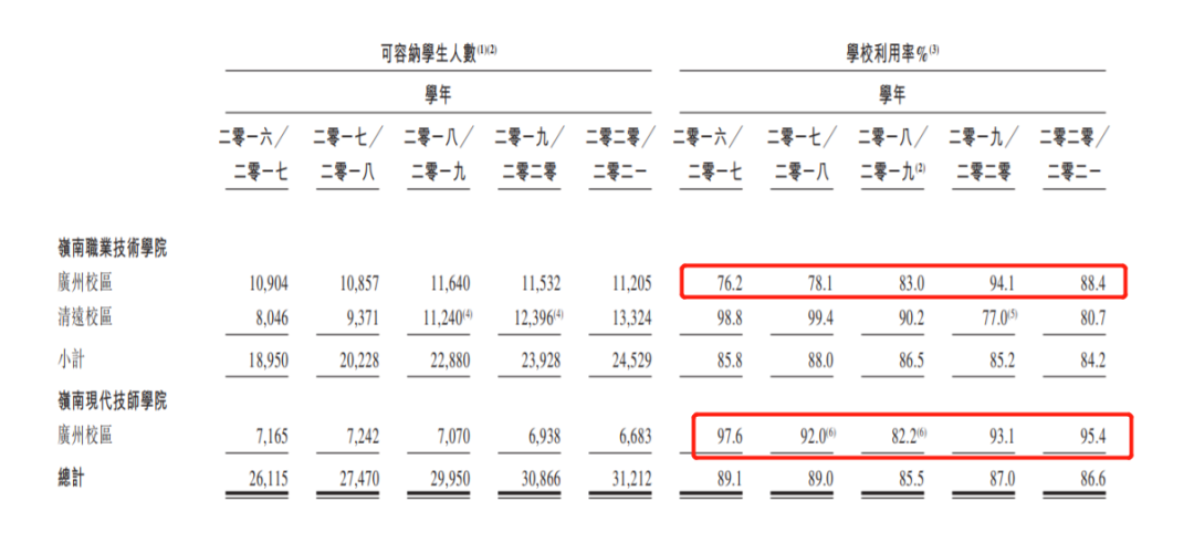 一個重要原因可能與學校的利用率有關。嶺南職業技術學院中,此前嶺南教育擴建了清遠校區,因此其利用率在最近兩個學期尚未飽和,只有80%左右。但廣州校區在2019/2020學年的利用率達到了94.1%。而嶺南現代技師學院中,最近兩個學年的利用率分別為93.1%和95.4%,接近飽和的狀態。