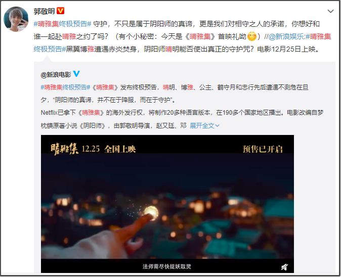 12月25號,郭敬明的《晴雅集》上映,對觀眾喊話“不要因為我而不喜歡鄧倫”。結果又被觀眾懟:網友討厭的是抄襲成性的你,和鄧倫有啥關係。
