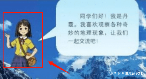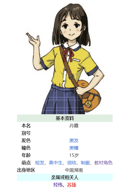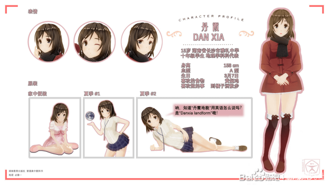 這位留着黑色短髮的JK名字叫做丹霞,登場於2019 年湖南教育出版社(湘教版)高中地理課本,必修兩期,選修三期皆有出現,與男同學經緯,女教師蘇揚三人同屬該課程的常駐角色。
