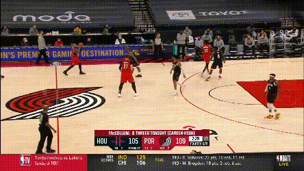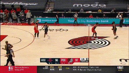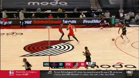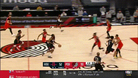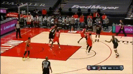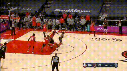 加時賽火箭試圖尋找一些變招,前兩個回合都是塔克和伍德兩人給哈登的雙掩護,但塔克不比獨行俠那些射手,在這種戰術裏其實沒有太多的變化餘地,最後都形成了換防,要靠哈登的單挑解決問題。其中第二次戰術的效果是,努爾基奇換防後被伍德牽制在45°三分線,哈登與伍德打了一次give and go,把開拓者防線打穿了。