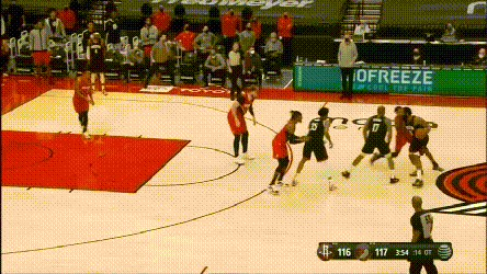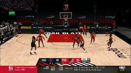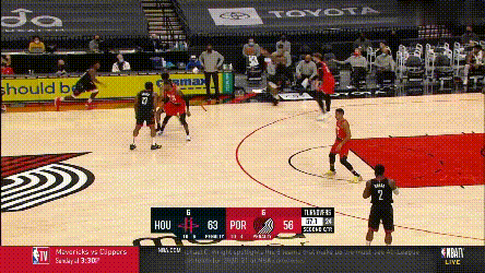 痛苦歸痛苦,開拓者的策略還是在下半場和加時賽裏幫到了開拓者。不得不説,塔克在這支火箭隊裏,可能是最拖進攻的球員之一。當開拓者非常熟練的用三個球員在底線站成護筐人牆的時候,你肯定不能指望哈登每個回合都能找到底角的塔克: