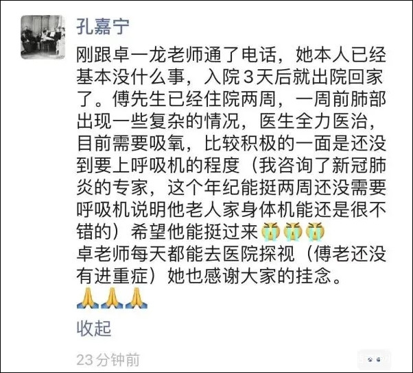 傅聰的學生、英國皇家音樂學院中國籍教授孔嘉寧在微信朋友圈發文稱:傅聰日前在英國感染新冠,已住院兩週,一週前肺部出現比較複雜的情況,醫生正全力醫治。目前傅聰需要吸氧,但萬幸還沒到需要呼吸機的程度,也沒有進加護病房。