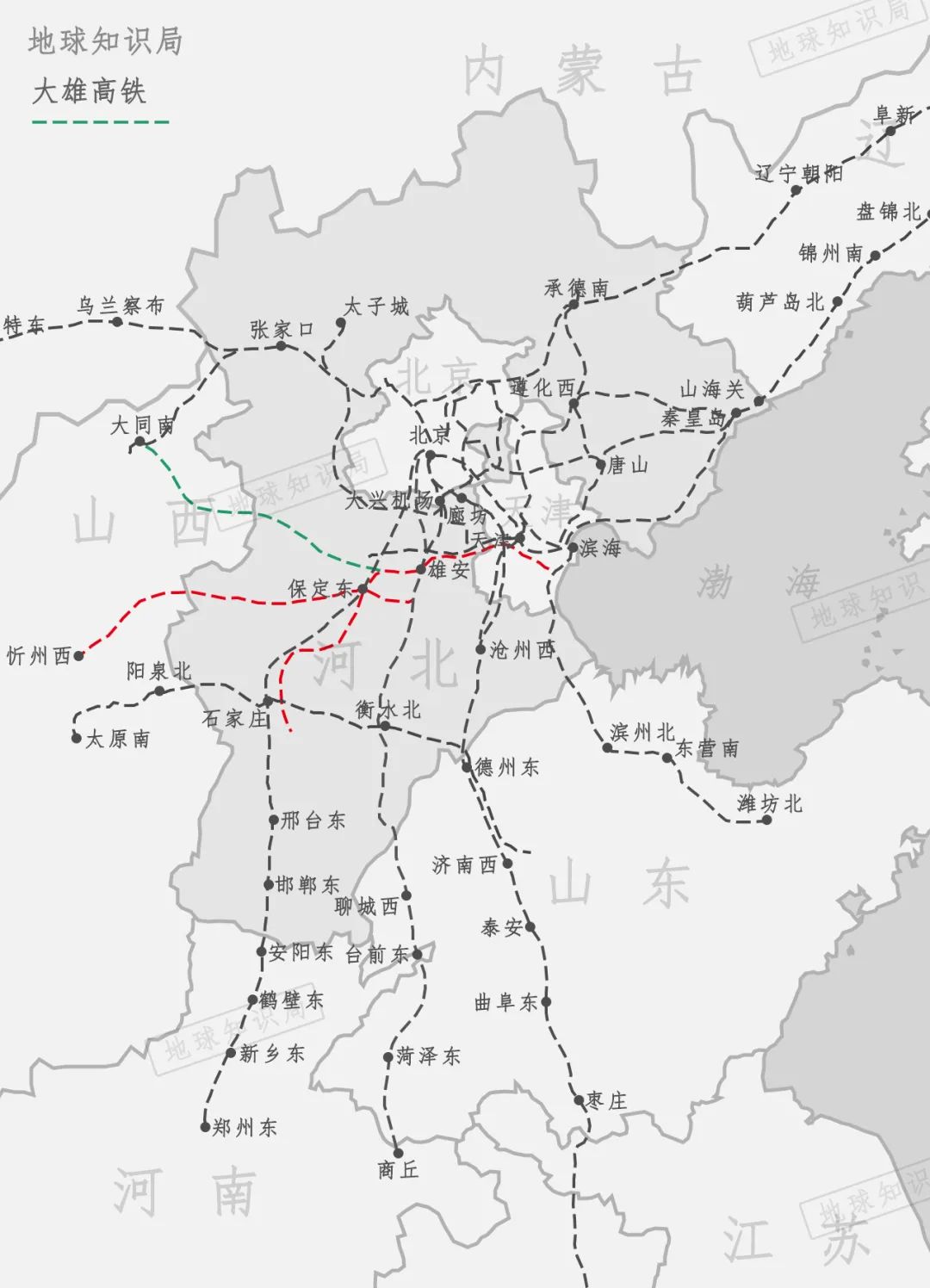 同時,雄安也引得鄰近省份十分重視,例如山西省之前曾單方面提出大雄高鐵。這條線對於內蒙古中西部以及山西北部可謂是又一條南下生命線,雖然這條線路在近期內未納入相關規劃,但這一事件足以説明雄安未來的重要樞紐地位。