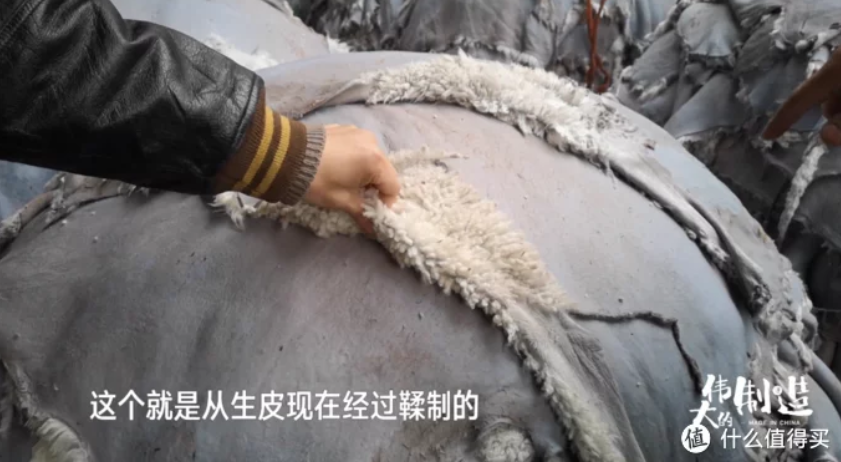 羊集裝箱裝船運來之後,第一個環節就是把皮子打開,把羊腿割掉。取大概12-13毫米的毛,洗淨、甩幹,接着把毛減掉,把肉皮去掉,只留下製作需要的真皮層。
