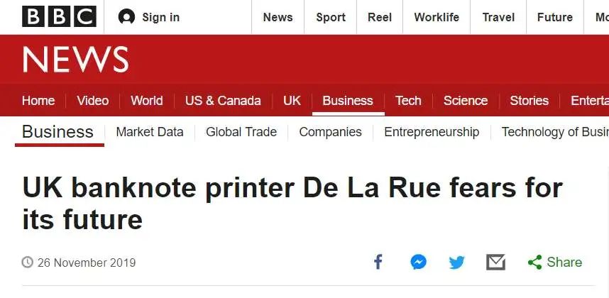 不研究不知道,一看嚇一跳。早在2019年末,世界最大印鈔公司德拉魯就對外發布了破產警告。