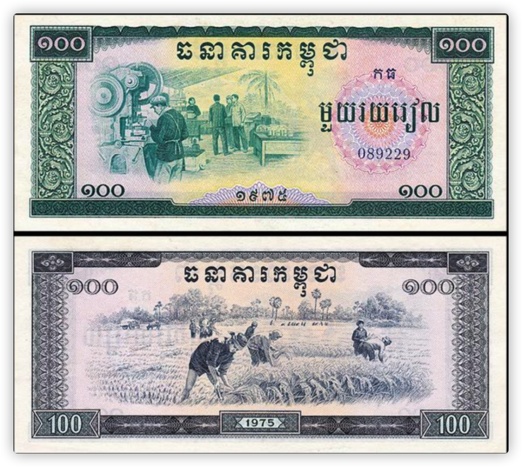 1974年,中國幫柬埔寨代印了7種面值的新版紙幣,面值為0.1、0.5、1、5、10、50、100瑞爾。