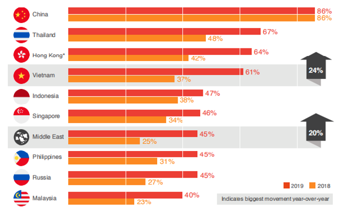 據普華永道發佈的《2019年全球消費者洞察力調查》顯示,在全球範圍內,中國使用移動支付的比例達到86%,位居全球第一。