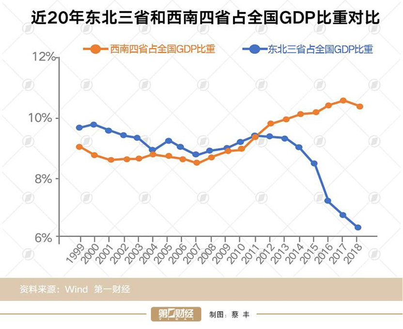 **3. 外循環的區位條件不夠好。**這幾年,深居內陸的大西南經濟發展遠比東北快得多。拿昆明來説,這是西南片區相當弱勢的省會城市,但是不知不覺當中,昆明的GDP(6475億元)已經超過了瀋陽(6470億元)、長春(5904億元)、哈爾濱(5249億元)這幾個東北工業重鎮。