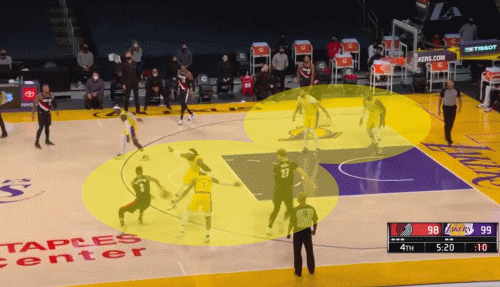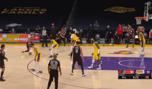 最後必須説的是湖人隊在關鍵時刻的陣容,看上去戴維斯打5、哈雷爾打4,詹姆斯打3,但哈雷爾經常防到外線,戴維斯也隨時跟出,所以籃下經常是詹姆斯守最後一道關,這可能是詹姆斯所有技術中,最薄弱的一個環節。