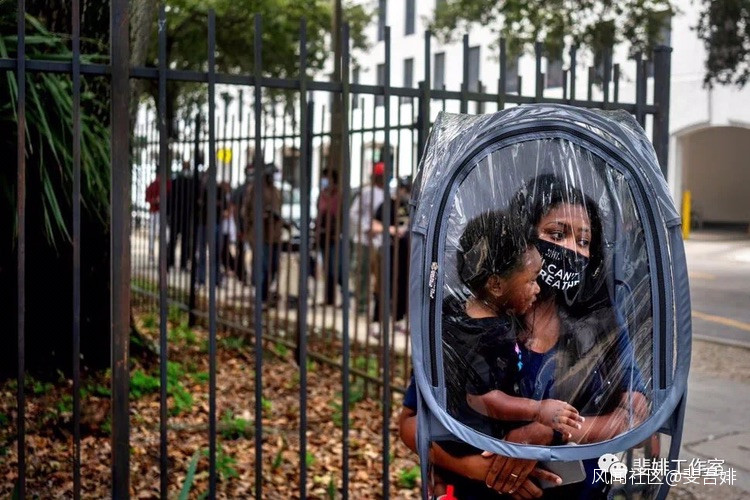 圖解:一名美國新奧爾良的老師達娜·克拉克(Dana Clark)抱着她18個月大的孩子,在市政廳門前排隊,等候總統選舉開始投票。她説,她戴着這樣的保護套是因為她不知道這裏排隊的多少人會戴口罩,而她的孩子沒有口罩,只能以這樣的方式保護孩子了,她也希望自己的學生能夠得到這樣的保護。